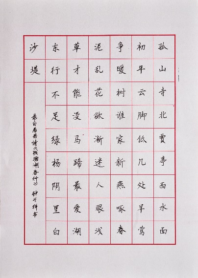 发展规划部钟兰祥以硬笔楷书抄录唐代现实主义诗人白居易之诗作《钱塘湖春行》,借用诗人对早春美景的描述,喻寓文投人走过丰收的2021年、喜迎2022年新春之激情。