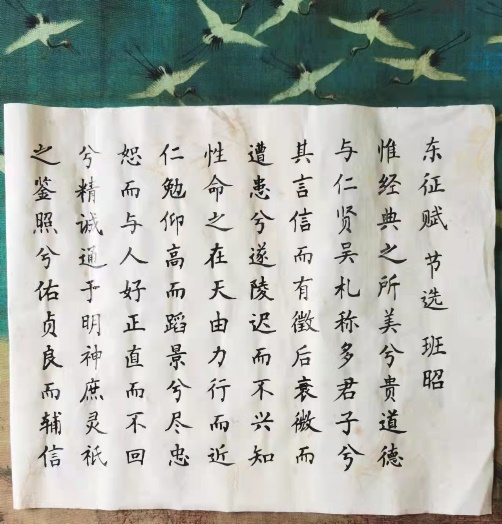 文化担保公司武钟辉节选了班昭《东征赋》,用小楷表现了汉代述行赋的代表作品。此赋融抒情、写景、思亲、咏史于一体,给人以坚持正道、敬业慎行的教导。