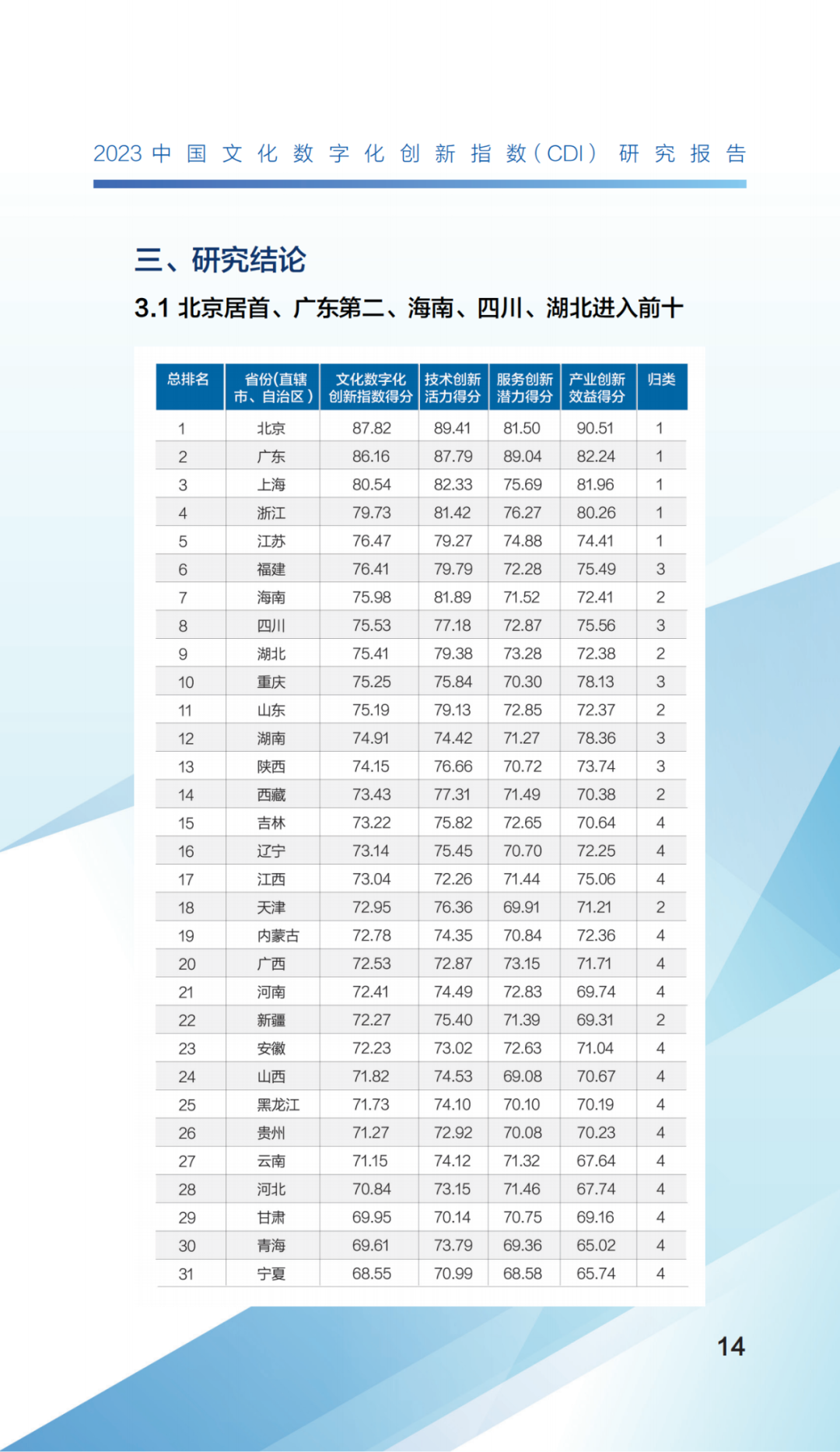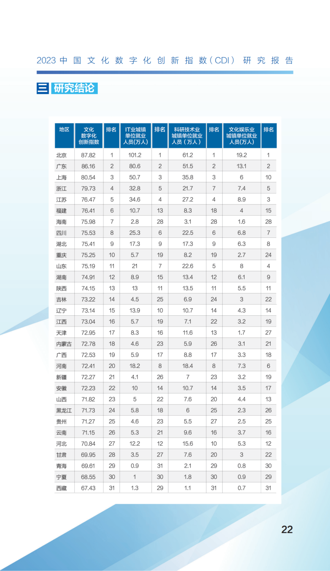 报告显示,各地文化数字化创新程度存在明显差别,在总得分排名中,北京居首、广东次之,上海位列第三,其余前十名由高到低依次为浙江、江苏、福建、海南、四川、湖北、重庆。