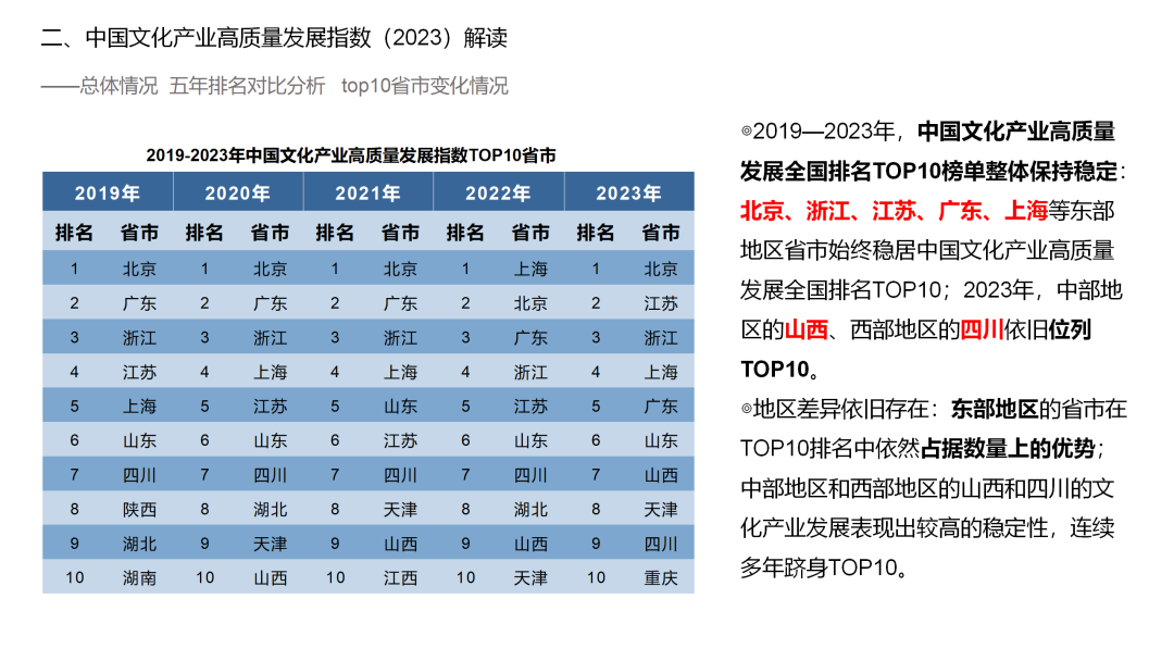 2019-2023年,中国文化产业高质量发展全国排名TOP10榜单整体保持稳定:北京、浙江、江苏、广东、上海等东部地区省市始终稳居中国文化产业高质量发展全国排名TOP10;2023年,中部地区的山西、西部地区的四川依旧位列TOP10。