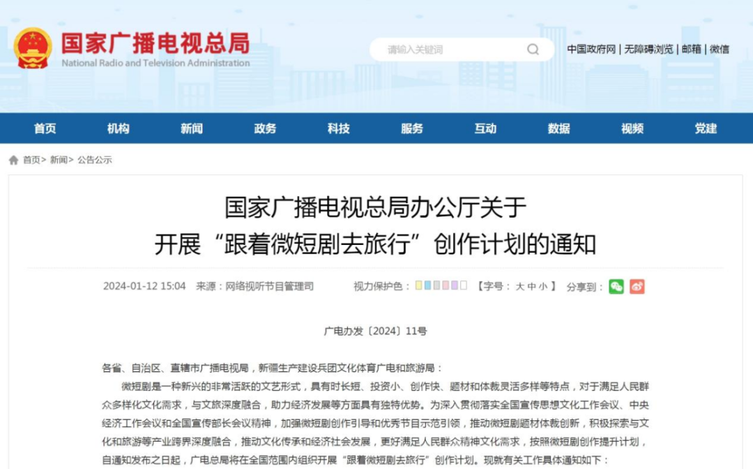 1月12日,国家广播电视总局办公厅发布了“跟着微短剧去旅行”创作计划,提出2024年要创作播出100部“跟着微短剧去旅行”主题优秀微短剧,推动一批实体取景地跟随微短剧的热播“出圈”,营造跟着微短剧去全国各地“打卡”的新风尚。