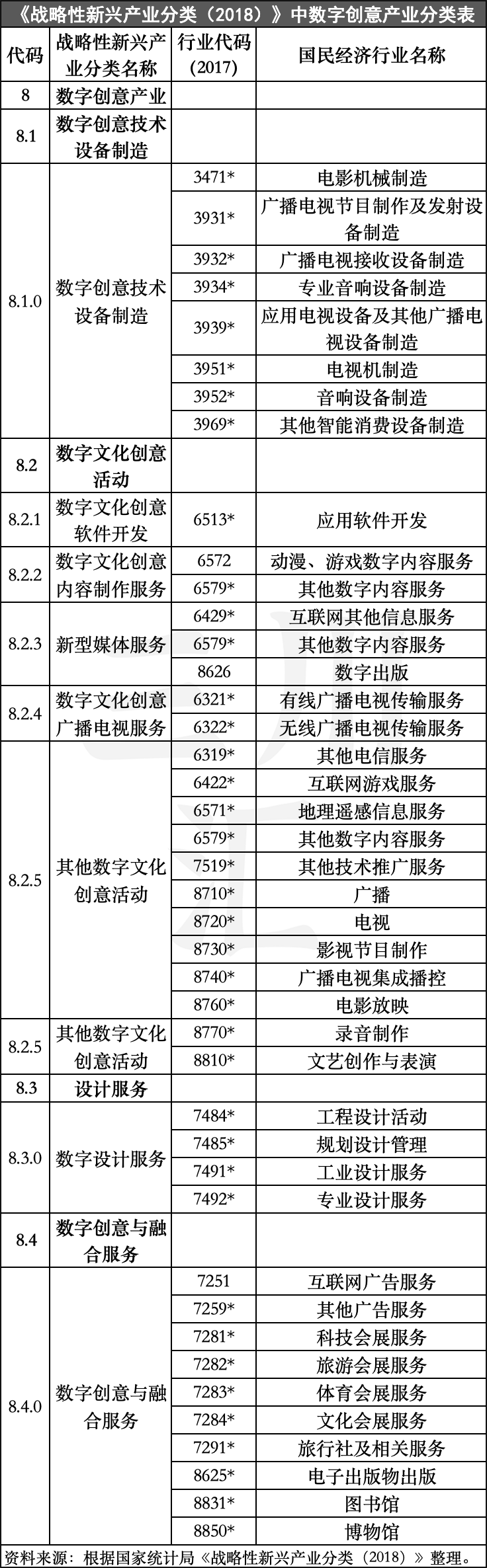 这次修订,通过细化分类和界定特征,确定了新一代信息技术、高端装备制造、新材料、生物、新能源汽车、新能源、节能环保、数字创意等八大产业,包含320个国民经济行业小类。其中,与大文化行业密切相关的数字创意产业被首次纳入分类统计范围,共划分为1个大类、4个中类和8个小类(并非全部),为相关企业提供了更明确的发展方向和机遇。